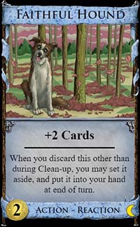 The ability does not work if Faithful Hound is put into your discard pile without being discarded; for example nothing special happens when you gain Faithful Hound, or put your deck into your discard pile with Scavenger (from Dark Ages).