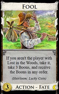 If you have Lost in the Woods, playing Fool does nothing. If you do not have Lost in the Woods, you take it - even from another player, if another player has it - and also take 3 Boons and receive them in the order you choose (discarding them when receiving them, or in Clean-up as appropriate).