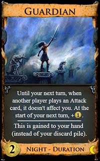 Since Night is after the Buy phase, normally you can play this the turn you buy it. When you play Guardian, you are unaffected by Attack cards other players play between then and your next turn (even if you want one to affect you). Guardian does not prevent you from using Reactions when other players play Attacks.