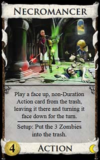 Necromancer can be used on a card that trashes itself when played; if the card checks to see if it was trashed (such as Pixie), it was not, but if the card does not check (such as Tragic Hero), it will function normally. Since the played card is not in play, "while this is in play" abilities (such as Tracker's) will not do anything.