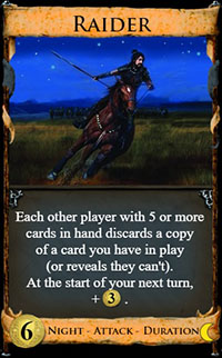 For example if your cards in play are 3 Coppers, a Silver, and a Raider, then each other player with at least 5 cards in hand has to discard a Copper, Silver, or Raider, or reveal their hand to show that they did not have any of those cards.