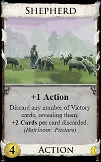 For example, you could discard three Victory cards to draw six cards. In games using Shepherd, replace one of your starting Coppers with a Pasture.
