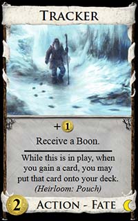 If you gain multiple cards with this in play, this applies to each of them - you could put any or all of them on top of your deck. This applies both to cards gained due to being bought, and to cards gained other ways with Tracker in play. Tracker is in play when you resolve its Boon, so if the Boon causes you to gain a card, for example a Silver from The Mountain's Gift, you can put that card onto your deck. In games using Tracker, replace one of your starting Coppers with a Pouch.
