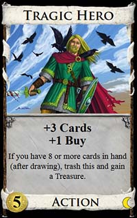 First draw three cards; then, if you have eight or more cards in hand, you trash Tragic Hero and gain a Treasure. If you cannot trash Tragic Hero (for example if you play it twice with Throne Room and trashed it the first time), you still gain the Treasure.