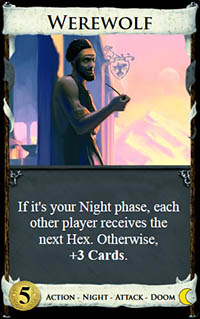 Werewolf can be played in either your Action phase or Night phase. If played in your Action phase, you draw three cards; if played at Night, each other player receives the next Hex.