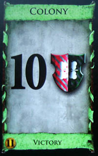 For example, choose a random Kingdom card being used - such as the first card dealt out from the Randomizer deck - and if it is from Prosperity, add Platinum and Colony to the Supply. Platinum and Colony are not Kingdom cards; when those are included, there are 10 Kingdom cards, plus Copper, Silver, Gold, Platinum, Estate, Duchy, Province, Colony, and Curse, in the Supply. Use 8 Colonies for a 2-player game, or 12 Colonies for a game with 3 or more players.