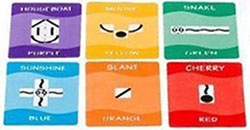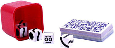 Using the figures that landed face up on the dice, the player should begin arranging his/her dice to match a doodle pictured on any one of the cards in the Gallery. (The "dash" figure cannot be turned to be used as an "angle" figure or vice versa).