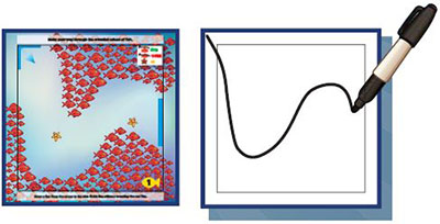 Each player gets a pen, a transparent doodle sheet, and a drawing board. Put your transparent doodle sheet on top of your board.