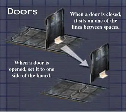 It costs a figure 2 spaces of movement to either open or close a door. Doors cannot be destroyed by attacks (although the invader player has a "Smash" card that can destroy doors), and they cannot be closed if the "door line" is blocked by an oversized invader.