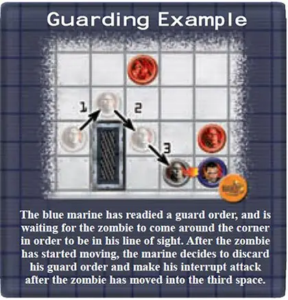 At any point during the invader player's turn, a Guard Order marine may discard his guard order to immediately interrupt the invader player's turn and make one attack (following all the normal rules for line of sight and attacking).