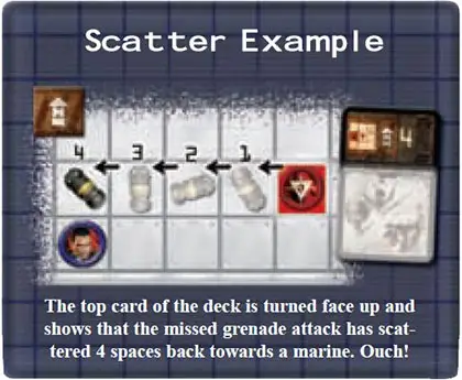 Some scatter diagrams show a "miss" icon. If such a card is drawn, there is no scatter movement and the attack explodes harmlessly and with no effect. See the diagram for a detailed example of scatter movement.