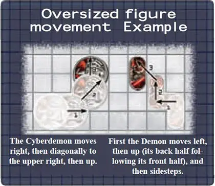 The demon moves to a diagonally adjacent space by moving both halves of its body in the same diagonal direction (also called "sidestepping"). Both types of movement are illustrated in the accompanying diagram.Other oversized figures (mancubus, hell knight, and cyberdemon) each occupy 4 spaces. When moving, these figures move like regular figures, and must always occupy four existing spaces, as shown in the diagram.