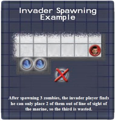 The invader player must place any spawned invaders on spaces that have no line of sight to any marine figures on the board.