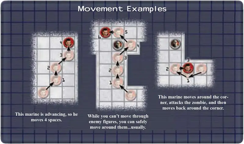 Example: An advancing marine could move 1 space around a corner, attack an invader, and then move 3 additional spaces in any direction (including back around the corner).
