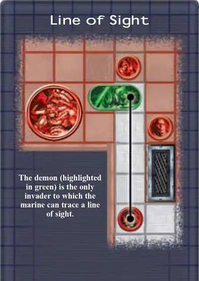 Example: In the diagram above, the marine has a line of sight to the demon invader shaded in green, but not those shaded red.