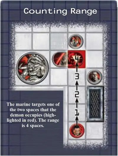 Next, the attacking player counts the number of spaces from the space occupied by the attacking figure to the targeted space. This is the range of the attack.
