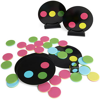One side of the card matches one side of the colored disks while the other side of the card matches the reverse side of the colored disks. Shuffle the pattern cards and place one in each card holder on either end of the board.