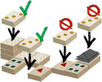 There are six types of tiles (see "Types of Tiles", to the right). After you have placed all of the tiles you collected on your turn, if you just created a set of at least 4 adjacent tiles of the same type, you MUST "Consolidate" them. When you Consolidate tiles, you must flip all of the Consolidated tiles face down.