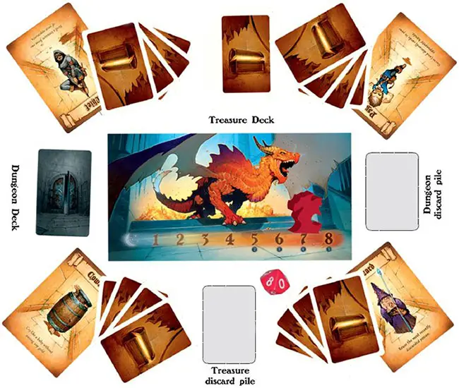 Shuffle the Treasure Cards and distribute 4 to each player. Place the remaining cards facedown above the Dragon Tile to form the Treasure Deck.
