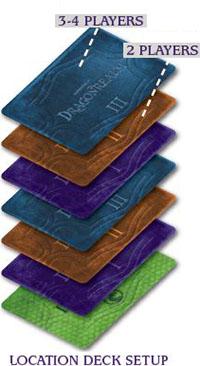 Create a Location deck by placing one random Dragon location (Green) face-down, then stack 6 more locations on top of it, alternating Purple (I) Orange (II), Blue (III), Purple (I) Orange (II), Blue (III).