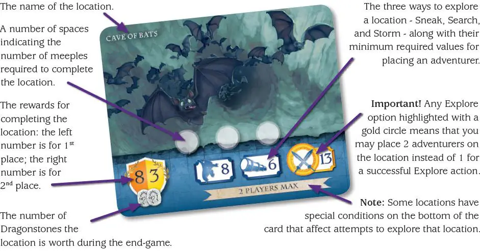 Explore Succeeds: Place 1 of your adventurer meeples on one of the location's open spaces. If that explore type has a gold circle around it, place 2 meeples instead.