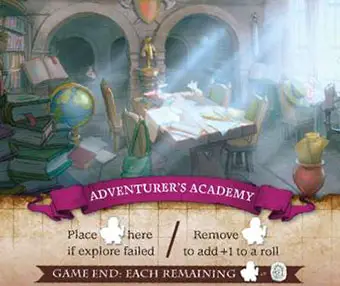 If you fail in your attempt to explore a location, head to the Academy to brush up on your adventuring knowledge. This may aid you in future explorations! On any future turn, you may remove one of your adventurers here after rolling to add + 1 to that roll.