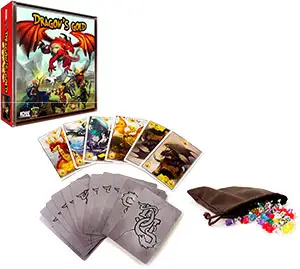 The Dragon cards are shuffled and placed facedown in the center of the table. This will form the draw pile for the Dragon cards. The top four Dragon cards are turned up and laid in a row in the center of the table. These are the first Dragons that may be attacked by the players.