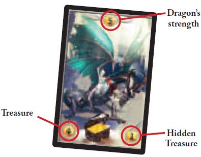 A known part, which is the number of random tokens drawn from the treasure bag as soon as the Dragon is placed in the center of the table. The number of tokens to be placed is indicated in the lower-left corner of the card.
