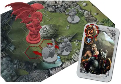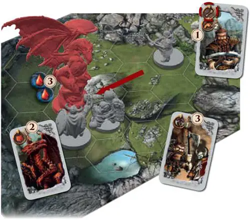 1On a later turn, John plays a card with the "Crossbow attack" symbol. His dwarf with the archery ability is in a hex row with the dragon, so he can shoot.2Kate, the dragon player, plays a defense card in reaction to this attack, so the dragon receives no wounds.