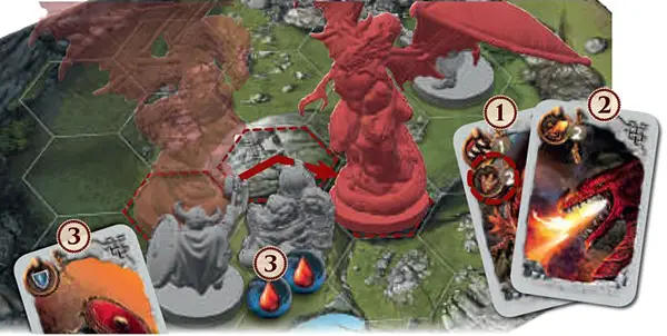 While unfilled, the dragon may use the Move symbol on the cards. This allows the dragon to move a number of hexes equal to the movement value next to the symbol.