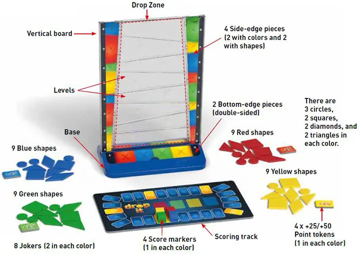 Players take turns dropping their shapes until all of the shapes have been dropped. Then, the player with the most points wins!