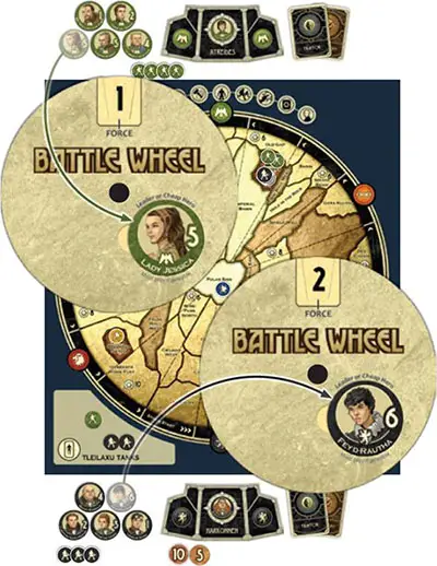 Each player picks up a Battle Wheel and secretly dials a number from zero to the number of forces they have in the disputed territory. Both players will lose the number of forces dialed on the Battle Wheel.
