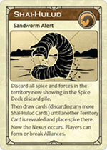 All spice and forces in the territory shown on the card now face up in the discard pile are removed to the Spice Bank and Tleilaxu Tanks respectively. Then the Shai-Hulud card is placed face up on the Spice Deck discard pile.