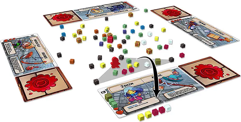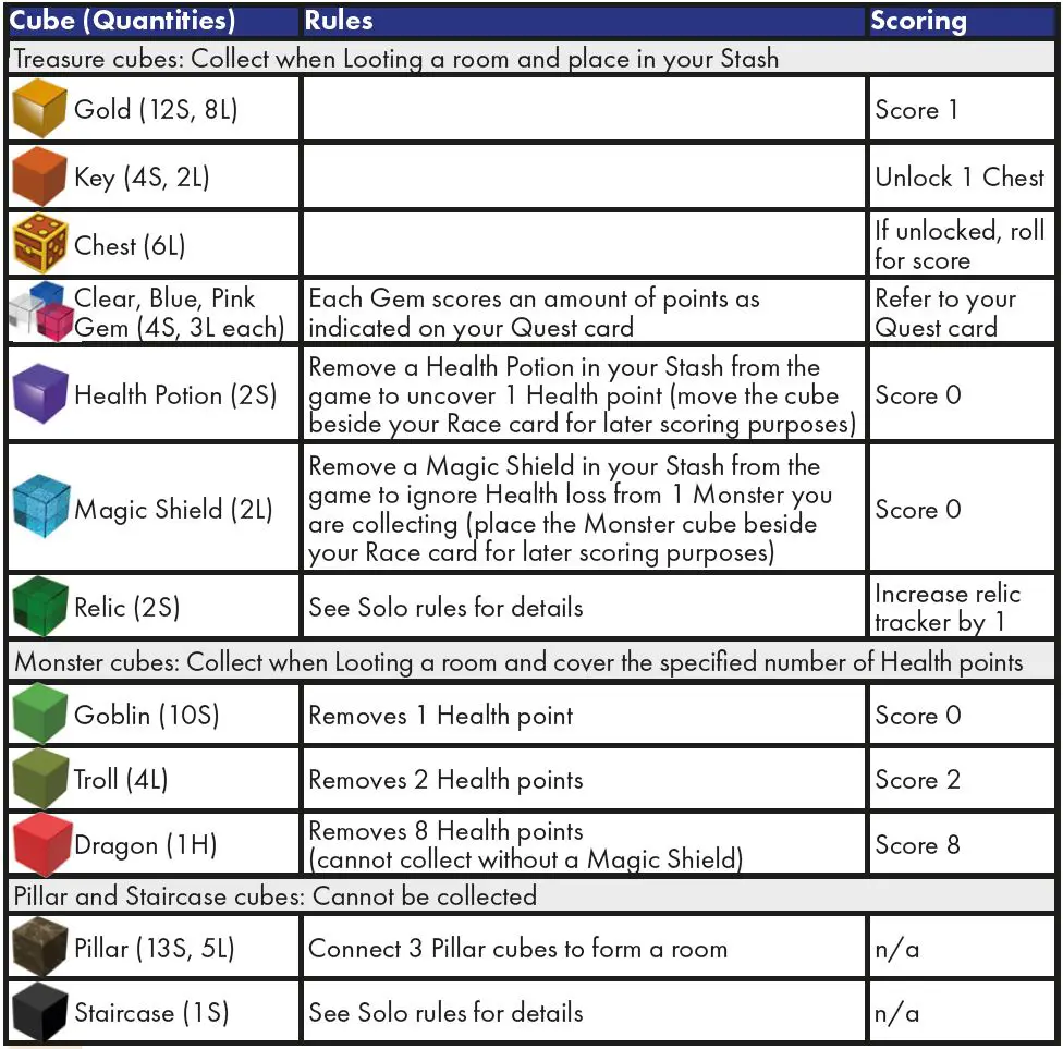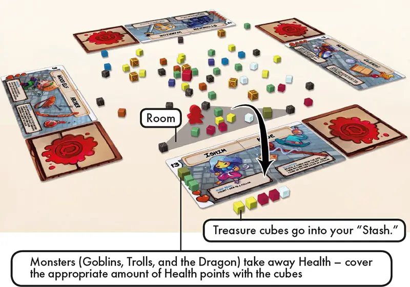 There are no re-dos, so be careful to use the correct amount of force. Oops! If you accidentally cause any cubes to fall off the table, the next player to act will drop them into the Dungeon as part of their Explore step.