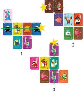 For example, in each of these three scenarios, if you placed the card highlighted by the yellow star, you would collect the green line.