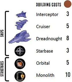 Build up to two Ships (Interceptors, Cruisers, Dreadnoughts and Starbases) or Structures (Orbitals and Monoliths). Pay their