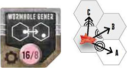 If you have the Wormhole Generator Technology, you may move your Ships through a hex edge that has a Wormhole on just one side. In the example below, movements A, B and C would be legal.