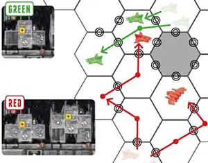 Green's Interceptors also have a Movement Value of 2, and Green has three moves. When moving, his first Interceptor is pinned by the Red Interceptor. The second one may move through the hex. Finally, Green decides not to use his third move.