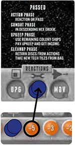 A Reaction is taken by placing an Influence Disc on the Reaction Track on your Summary Card.