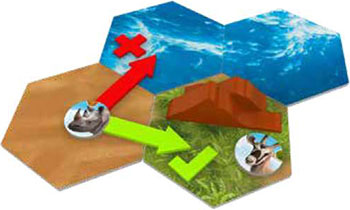 When moving an Animal token, the animal may move onto a Map tile containing other animals and may even move onto a type of terrain that does not match it.