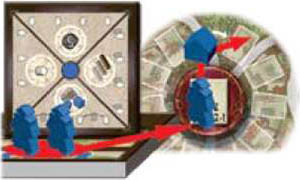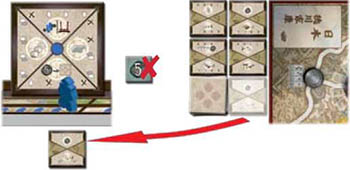 To activate this action, the player must have one of his samurai on the merchant figure's current location for each official on his planning board assigned to this action.