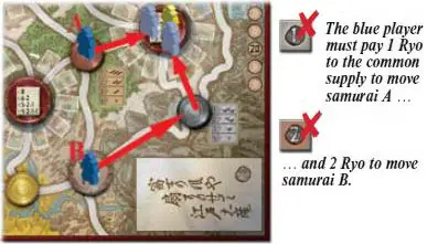 Before revealing his authorization card, a player may move any number of his samurai on the game board. Samurai may move to spaces containing other samurai. The player must pay 1 Ryo to the common supply for each space that he moves a samurai.
