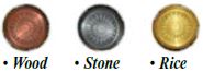 There are 3 types of resources - wood, stone, and rice; each resource type has a corresponding action to produce it, as well as corresponding resource spaces on the game board.