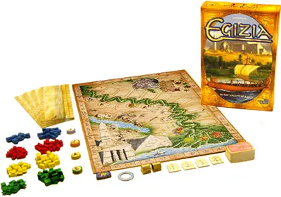 Egizia lasts for 5 rounds. In each round, the players can increase the strength of their construction crews, add new quarries or fields, take Nile and sphinx cards, and cooperate in the building of king's graves, obelisks, pyramids, and temples.