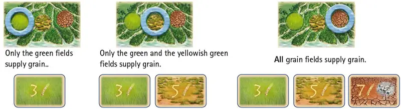 If the player has at least as much grain as the strength of his construction crews, nothing occurs. If the player has less grain, then he must lose points on the scoring track. His score may go below zero.