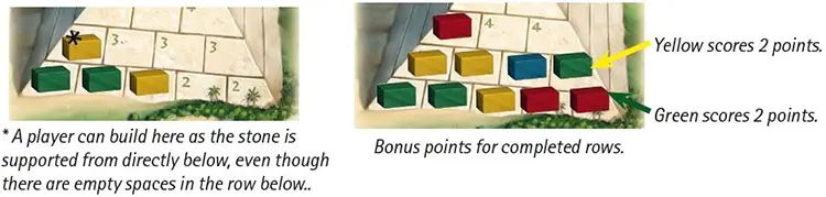 When a player completes a row of the pyramid, the player who built the most scores bonus points (see example below). s Then, the next player (next closest to the Nile) takes his turn.