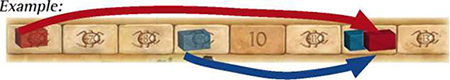Red builds and gets 5 points. He moves 5 spaces on the scoring track. Then blue builds and gets 3 points. She moves 3 spaces to the same space where red is. She places her stone behind red.