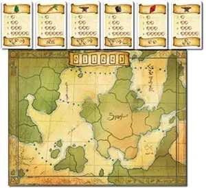 Shuffle the cards and place them in a deck face down next to the board. Draw six cards and place them face up in a row along the top of the board.
