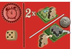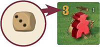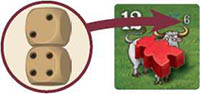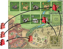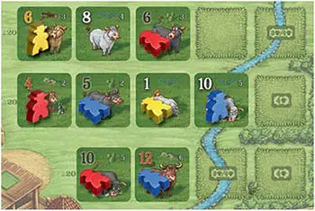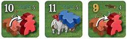 In a 2-player game only: Take the 12 Cattle Tiles of one race and place 6 of them face down on the 6 Pasture Spaces with the "not used in 2-player games" symbol to indicate these spaces are not available. Put the remaining 6 tiles of that race back into the game box.