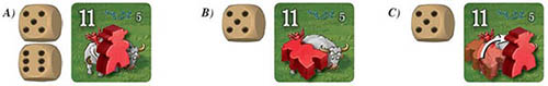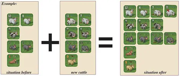 Example: The white Herd has to be sold now. The black Herd could still grow. The brown Herd cannot grow any more by adding collected Cattle, but it will only be sold when another Cattle Tile of the same race is about to be added (or at the end of the game). (Exception: Special Actions, see there).